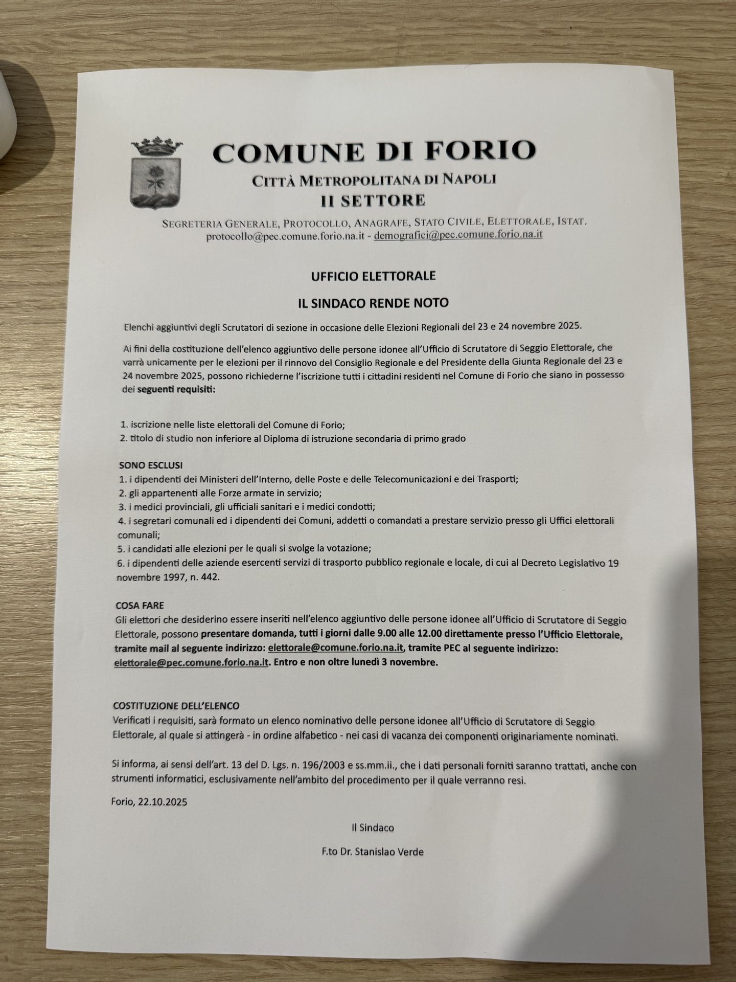 Elenchi aggiuntivi degli Scrutatori di sezione in occasione delle Elezioni Regionali del 23 e 24 novembre 2025.