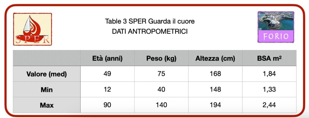 Nel periodo 15.01.25 – 08.02.25 ci sono state 510 prenotazioni. Hanno partecipato effettivamente 402 persone (79%) di cui 236 donne (58,7%) e 166 uomini (41,3%). L’età media dei partecipanti è stata di 49 anni (max 90 anni , min 12 anni). Il peso medio 75kg (min 40kg, max 140kg), altezza media 168cm (min 148cm, max 194cm). Dei partecipanti 23% erano ipertesi, 4% diabetici, 17% fumatori, 20% colesterolo elevato (vedi tab.2)