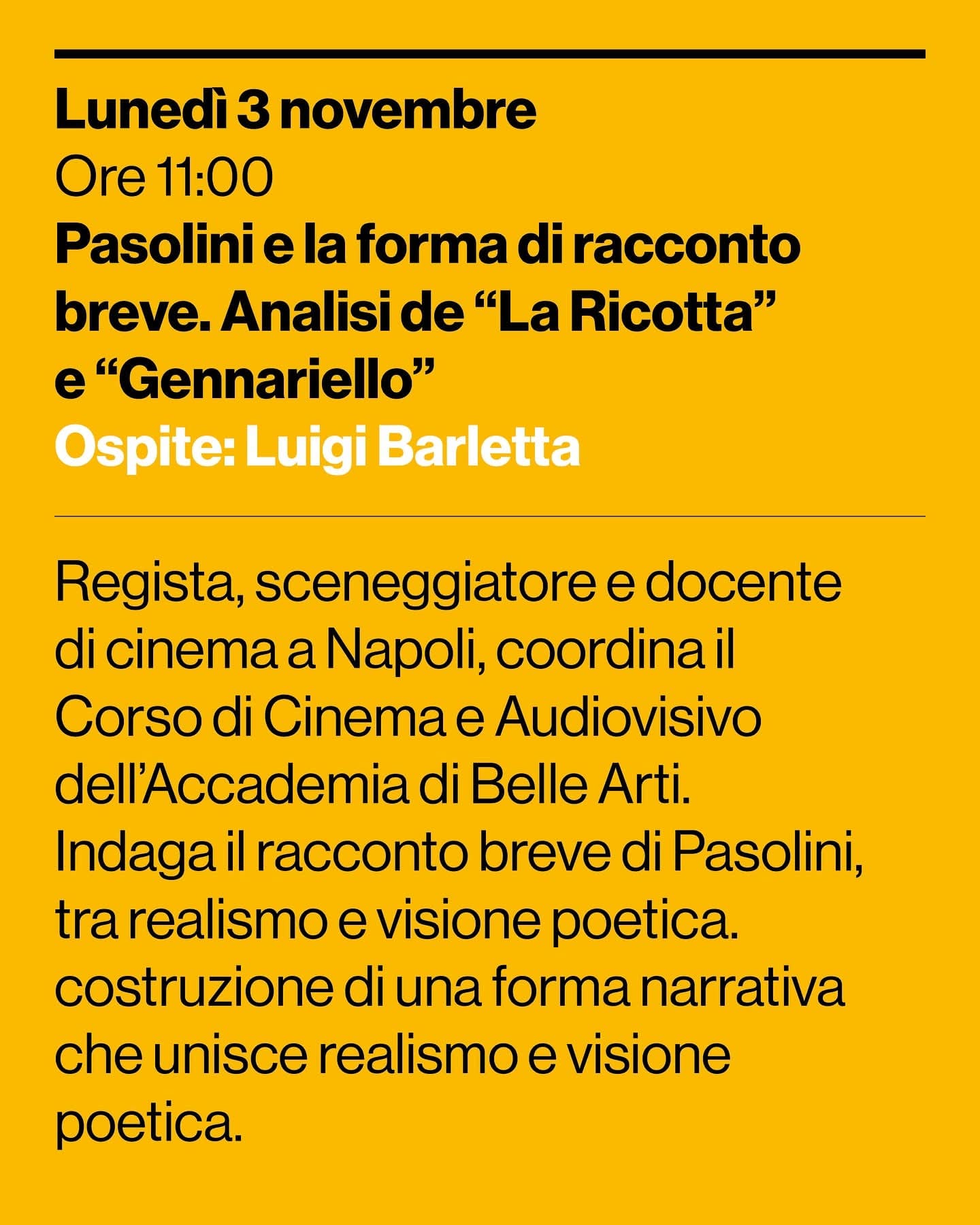 L’incontro indaga la dimensione del racconto breve nel cinema e nella scrittura di Pasolini, attraverso la costruzione di una forma narrativa che unisce realismo e visione poetica.
