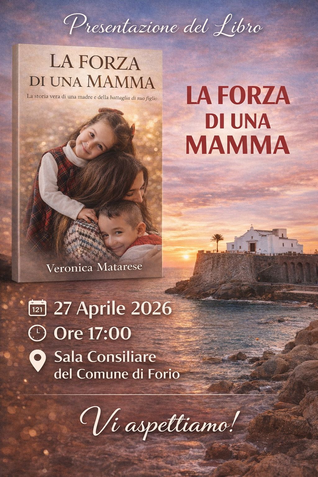 Veronica Matarese, con il patrocinio morale del Comune di Forio, è lieta di invitare alla presentazione del suo primo libro “La forza di una mamma”, che si terrà il giorno 27 aprile 2026 alle ore 17:00 presso la Sala Consiliare.