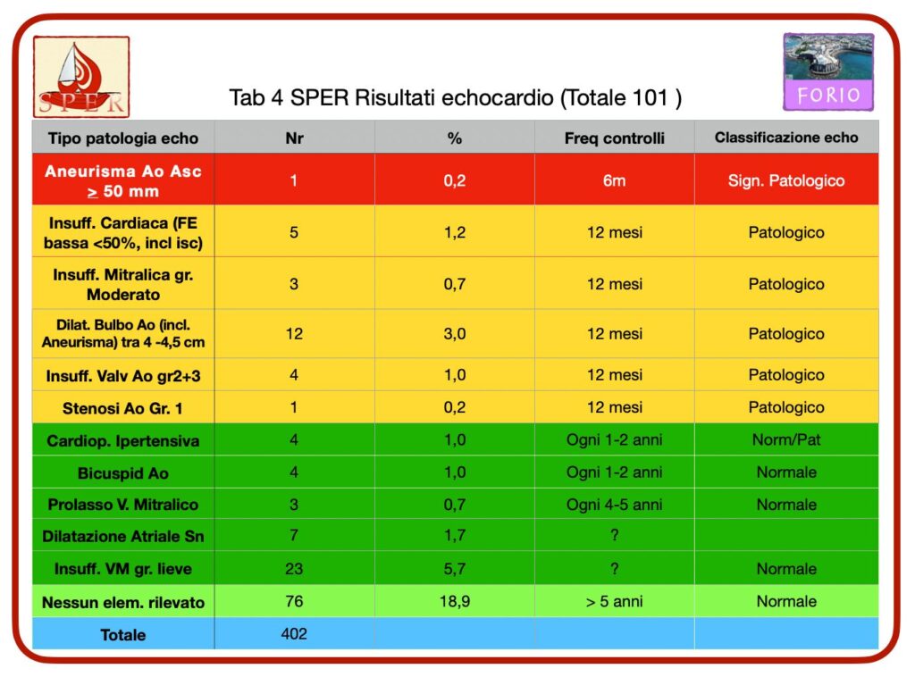 Dei 402 partecipanti 15 (3,7%) avevano elementi patologici rilevanti (vedi tab 4). Un solo paziente aveva patologia grave con indicazione alla terapia chirurgica. 45 (11%) avevano patologie non gravi, da monitorare periodicamente.