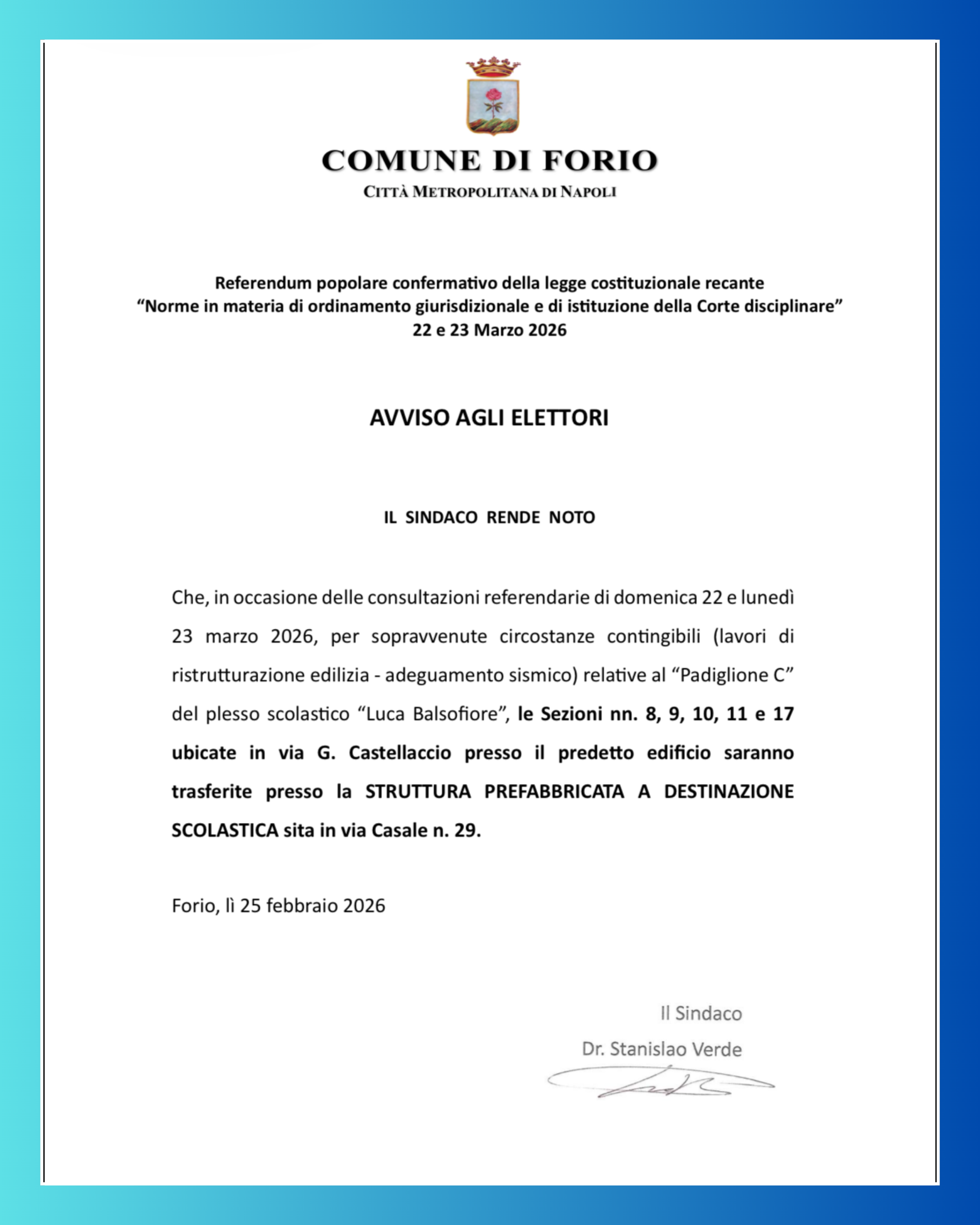 Il Comune di Forio informa la cittadinanza che, per sopravvenute circostanze contingibili legate a lavori di ristrutturazione edilizia e adeguamento sismico presso il Padiglione C del plesso scolastico “Luca Balsofiore”, le seguenti sezioni elettorali: