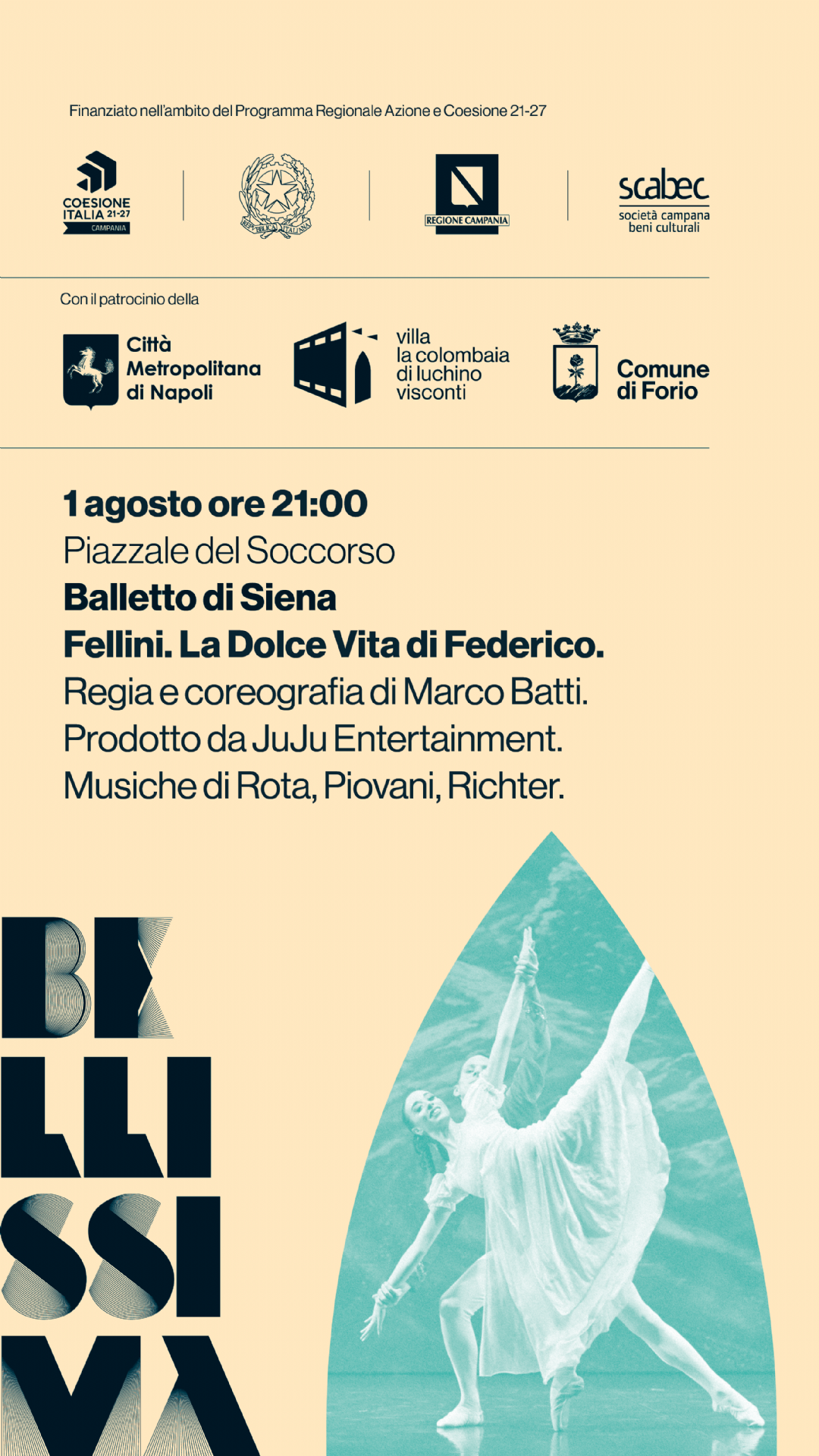 Il Balletto di Siena, diretto da Marco Batti, porta in scena Fellini – La Dolce Vita di Federico, uno spettacolo suggestivo e onirico ispirato all’immaginario cinematografico del grande regista. Una coreografia elegante e poetica, tra sogno e realtà, per rievocare la magia dei film felliniani attraverso il linguaggio della danza.