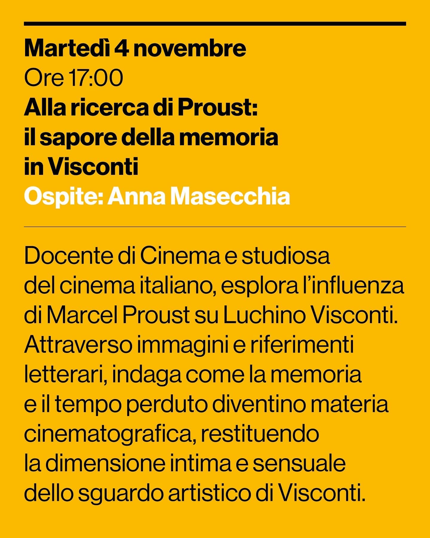 Docente di Cinema, Televisione e Fotografia studiosa del cinema italiano e del rapporto tra letteratura e immagine. L’incontro esplora l’influenza di Marcel Proust sull’immaginario viscontiano, indagando come il tema della memoria e del tempo perduto diventi materia cinematografica, capace di fondere l’esperienza del ricordo con la costruzione della forma visiva. Attraverso immagini, riferimenti letterari e frammenti iconografici, Anna Masecchia guida un percorso che mette in dialogo il romanzo proustiano e il cinema di Luchino Visconti, restituendo al pubblico la dimensione più intima e sensuale del suo sguardo artistico.